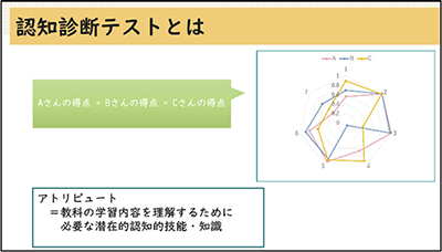 開発の出発点となっているのは、聴解テストの合計得点が同じでも、音声的特徴の認知能力、主旨理解能力、推測能力といった、「アトリビュート(=教科の学習内容を理解するために必要な潜在的認知的技能・知識)」ごとに、得意・不得意があるという考え方です。このテストでは、それぞれの受験者について、各アトリビュートが習得されている確率を算出します。